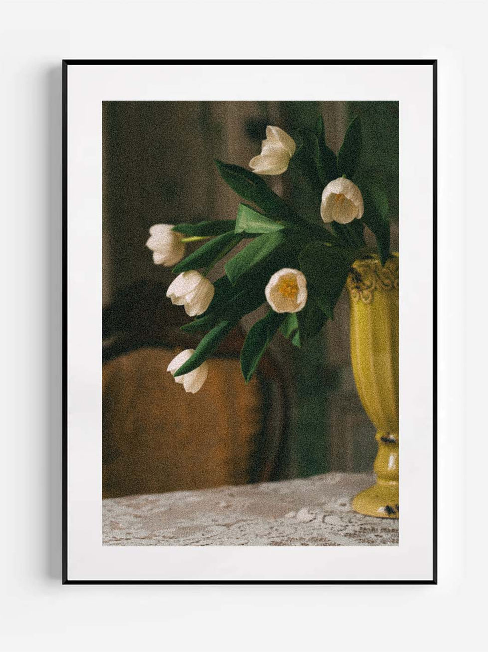 הצבעונים הלבנים נחים באגרטל בגוון חרדל, מונח ברוך על שולחן מכוסה תחרה.